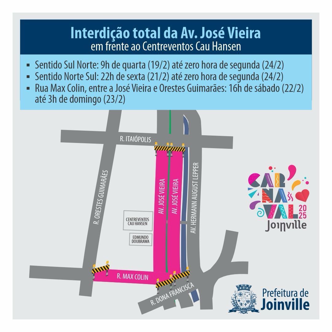 O Departamento de Trânsito de Joinville (Detrans) informa que algumas vias terão interdição total ou parcial para a realização do Carnaval de Joinville 2025. As medidas são para a montagem e a realização do evento. Agentes do Detrans estarão no local orientando motoristas.