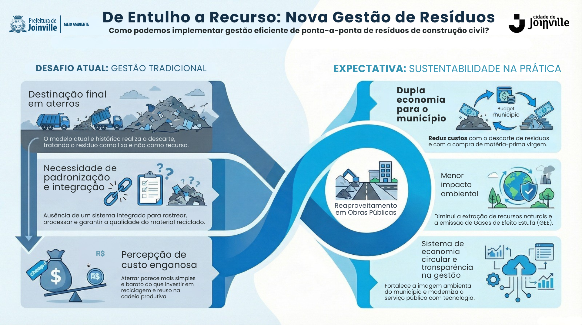 Descrição do problema: Como o município de Joinville pode implementar uma gestão, logística, reaproveitamento e reciclagem de Resíduos de Construção Civil (RCC) não perigosos para rastrear, inventariar e padronizar o uso prioritário de agregados reciclados, a sustentabilidade da cadeia produtiva e a otimização de custos operacionais, em obras públicas.