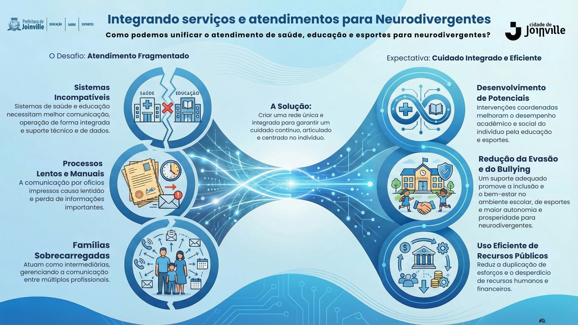 Descrição do problema: O desafio consiste em desenvolver uma solução que integre de forma coordenada os serviços de saúde (avaliação, diagnóstico, terapias, acompanhamento clínico), os serviços de educação (acolhimento escolar, adaptações pedagógicas, apoio especializado) e os serviços de esportes (fomento de políticas e práticas desportivas formais e não formais) para garantir um cuidado contínuo, articulado e centrado na pessoa neurodivergente.