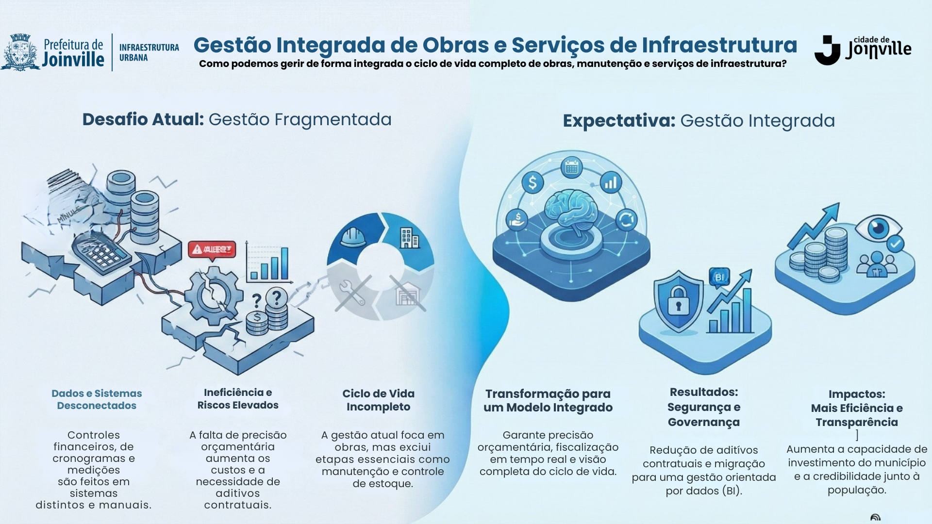 Descrição do problema: A fragmentação dos dados em todo o ciclo de vida dos projetos de infraestrutura e serviços compromete uma administração pública eficiente baseada em resultados. Atualmente, controles de financeiro, quantitativos, medições, cronogramas e indicadores são realizados em sistemas distintos e não integrados, exigindo articulação manual via planilhas. Essa desarticulação gera ineficiência no planejamento, pois a falta de precisão orçamentária e de prazo eleva o risco de custos e aditivos contratuais. Na execução e fiscalização, há uma falta de visão completa, ausente a integração de gerenciamento de projetos, gestão financeira e gestão de saúde e segurança (SSO). Adicionalmente, a gestão se restringe primariamente a projetos de obra, sem cobrir as etapas de manutenção urbana, manutenção de edificação pós-obra, controle de estoque e a gestão de quantitativos de Atas de Registro de Preços e sem suporte para integração Building Information Modeling (BIM) do projeto