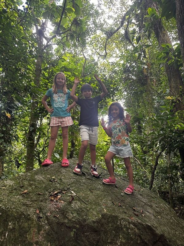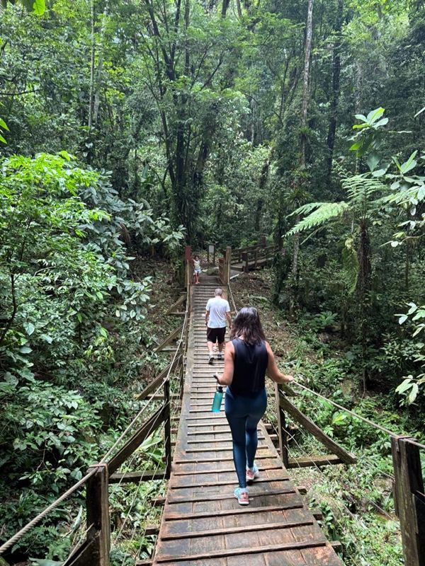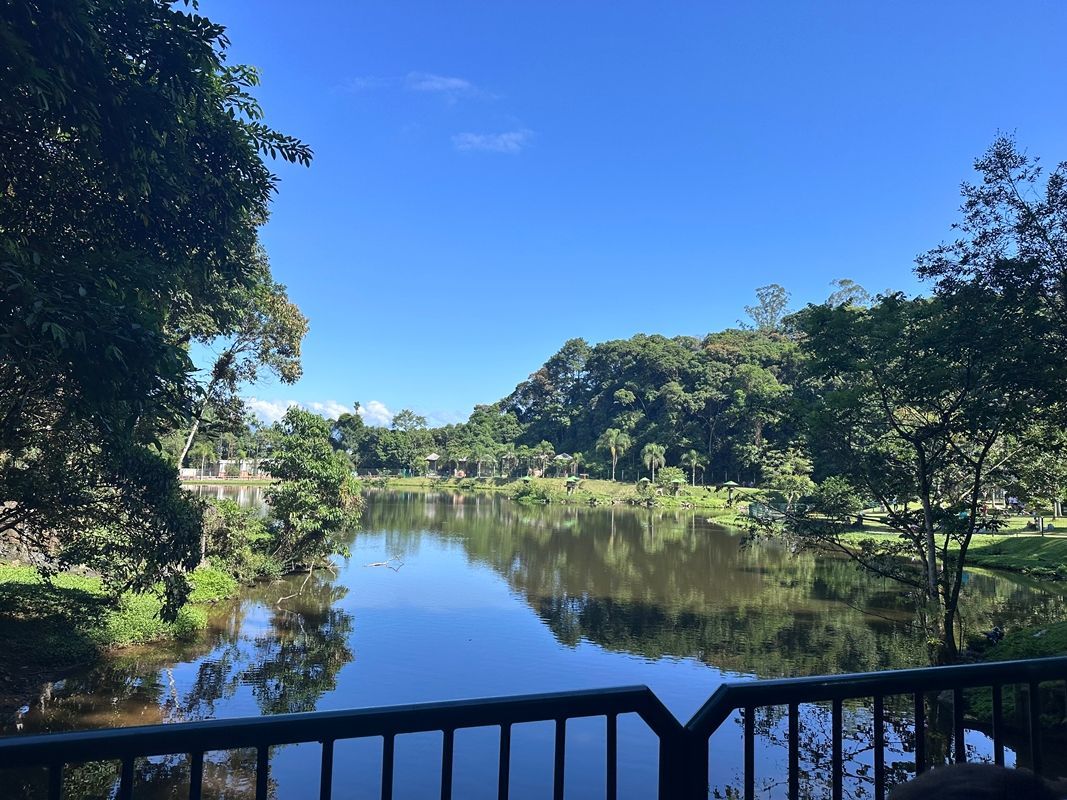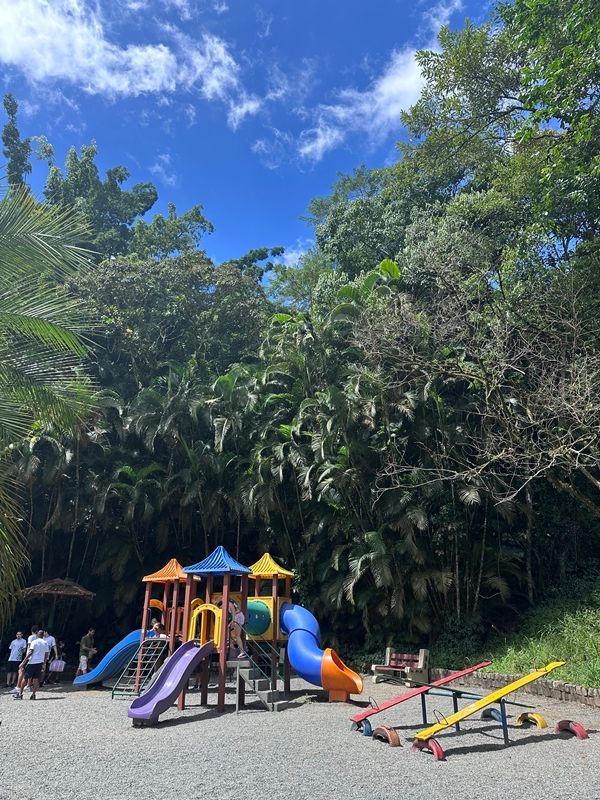 Deixamos o carro perto do Restaurante Casa do Capitão e subimos com nossas comidinhas. Depois do portal do Parque Morro da Boa Vista, o trajeto só pode ser feito a pé, mas até o ZooBotânico são só 5 minutinhos de caminhada – uma subida leve, cercada de sombra e com o som da água correndo ao lado. Sempre brinco com meus filhos que essa é uma "mata do amor", porque as árvores são cobertas por aquela trepadeira Jiboia, cujas folhas têm formato de coração. 💚