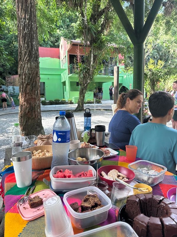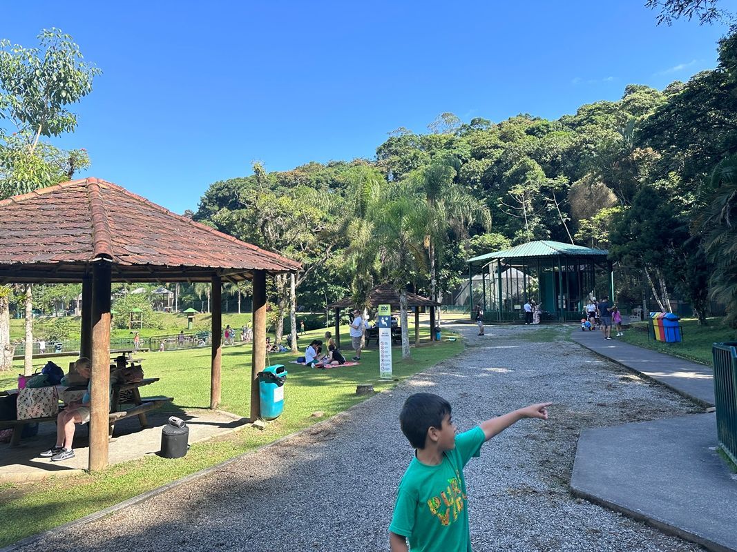 Marcamos para sábado de manhã e demos muita sorte: o dia estava lindo! Convidei outras famílias do grupo da escola, e várias confirmaram presença. O ZooBotânico abre às 9h, então queria chegar pontualmente para garantir uma boa mesa e montar nosso piquenique.