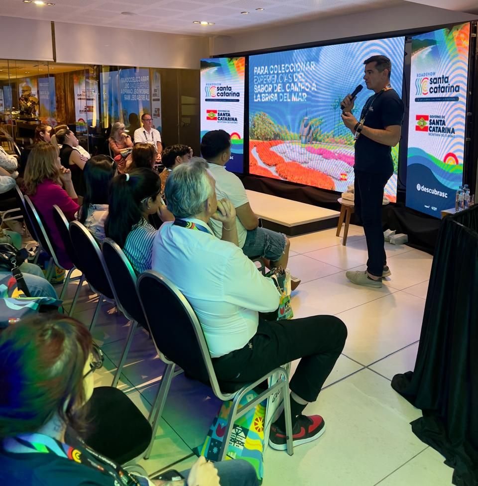 O evento foi estruturado em dois momentos complementares: uma rodada de negócios, que possibilitou contato direto entre destinos e operadoras, e uma apresentação em sala de capacitação, onde Joinville teve a oportunidade de detalhar seus atrativos e posicionar-se como um destino que complementa e diversifica a imagem tradicional do estado, mostrando um Santa Catarina que vai além das praias, com experiências culturais, naturais e gastronômicas únicas.