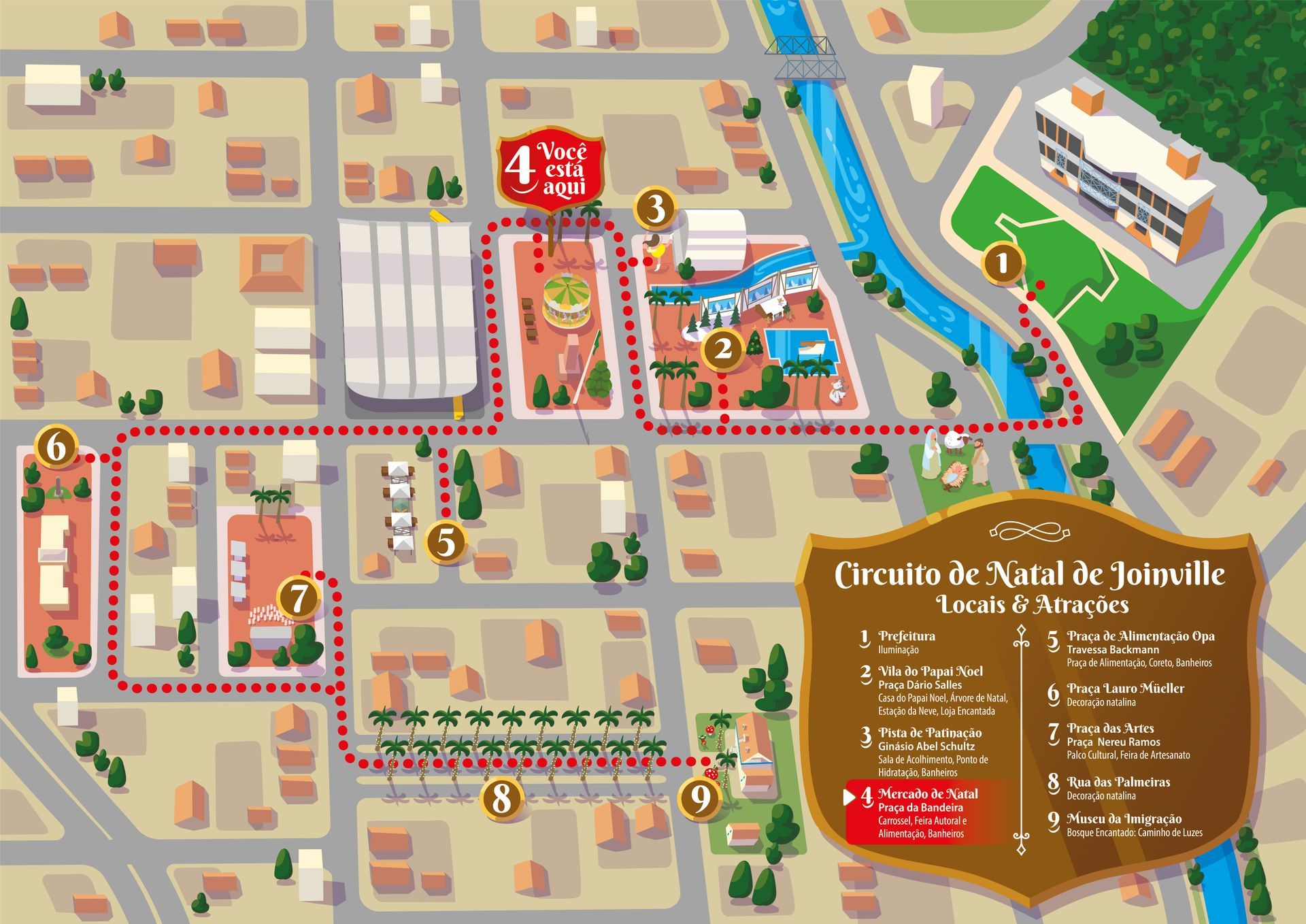 Onde: Circuito de Natal - Praças Dario Salles, da Bandeira e Nereu Ramos, Travessa Bachmann, Praça Lauro Mueller, Rua das Palmeiras, Prefeitura, Rua Rio Branco e Museu Nacional de Imigração e Colonização (MNIC)