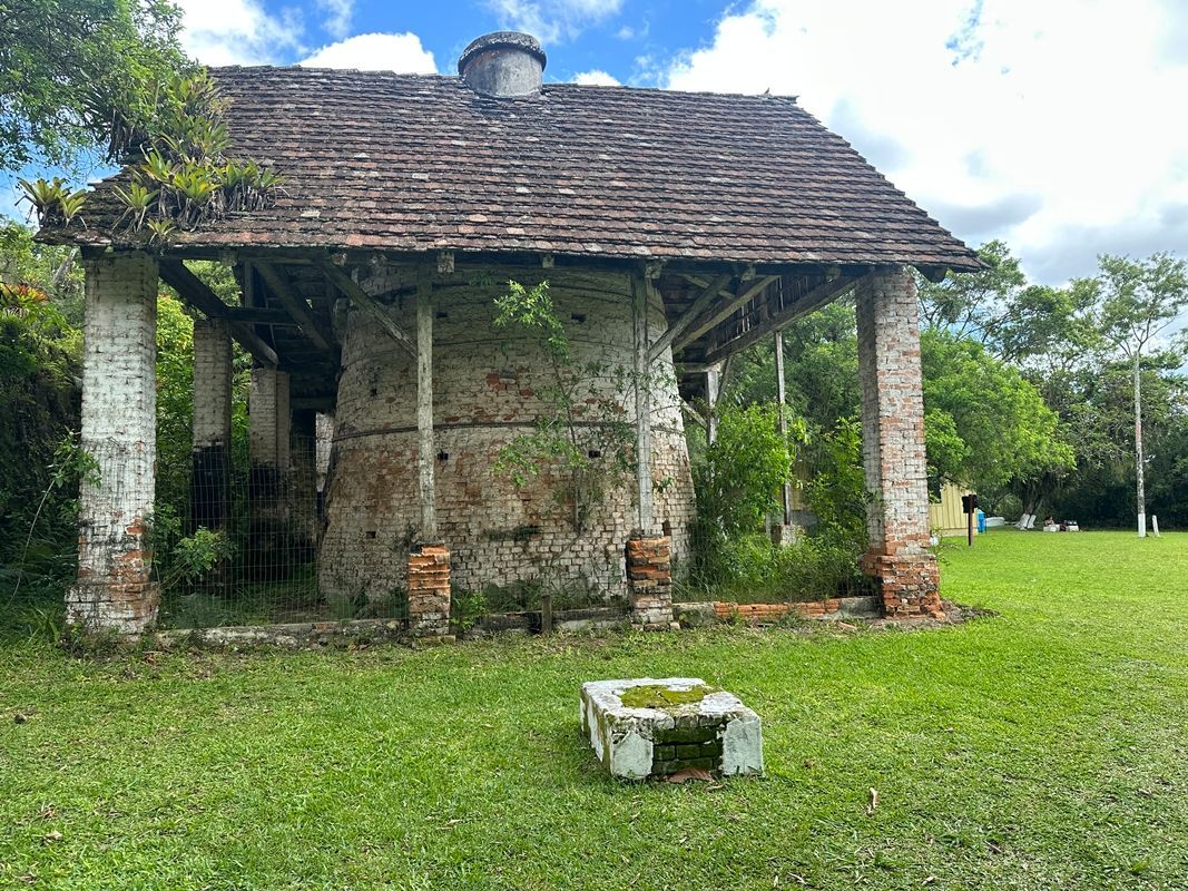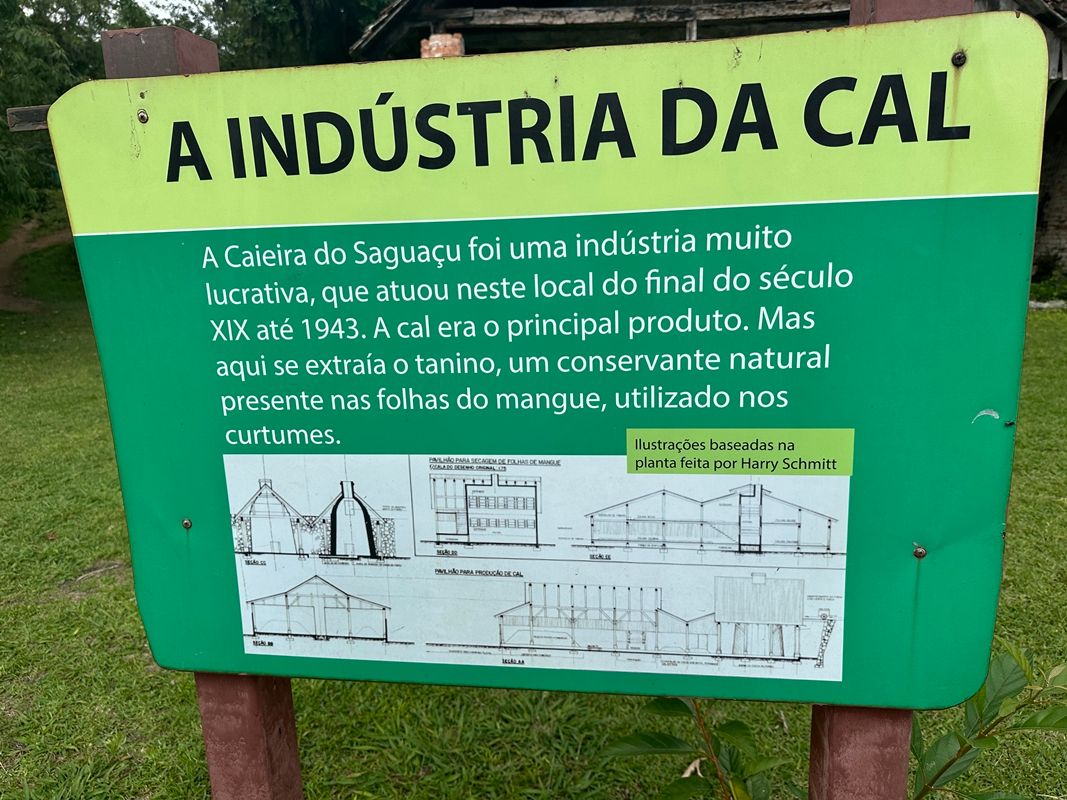 Você irá reparar grandes fornos perto da baía, pois antigamente as indústrias caieira eram muito fortes na região. Elas retiravam as conchas dos sambaquis, queimavam nos fornos por vários dias, depois eram trituradas para fazer cal. Por isso o nome do Parque Caieira.