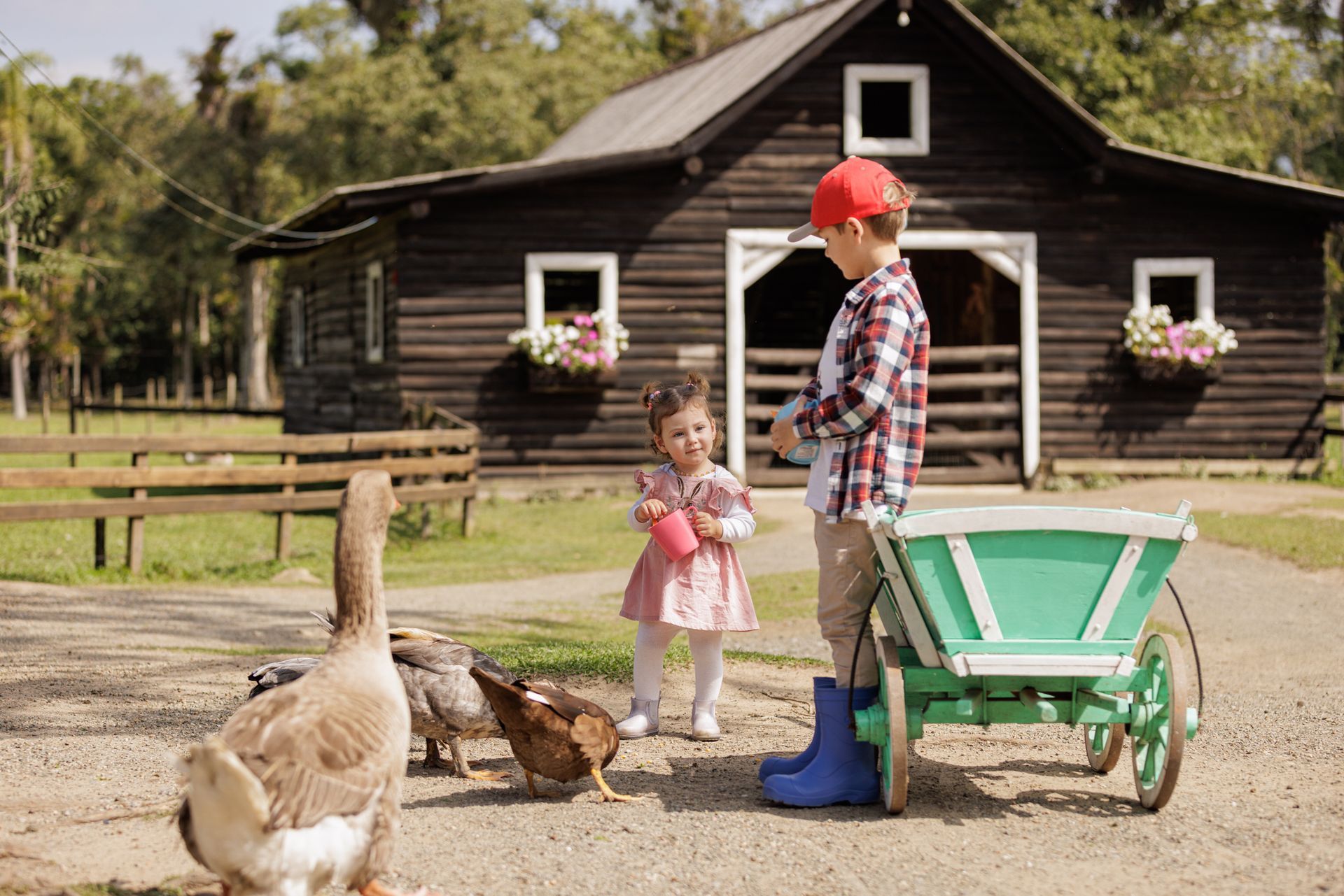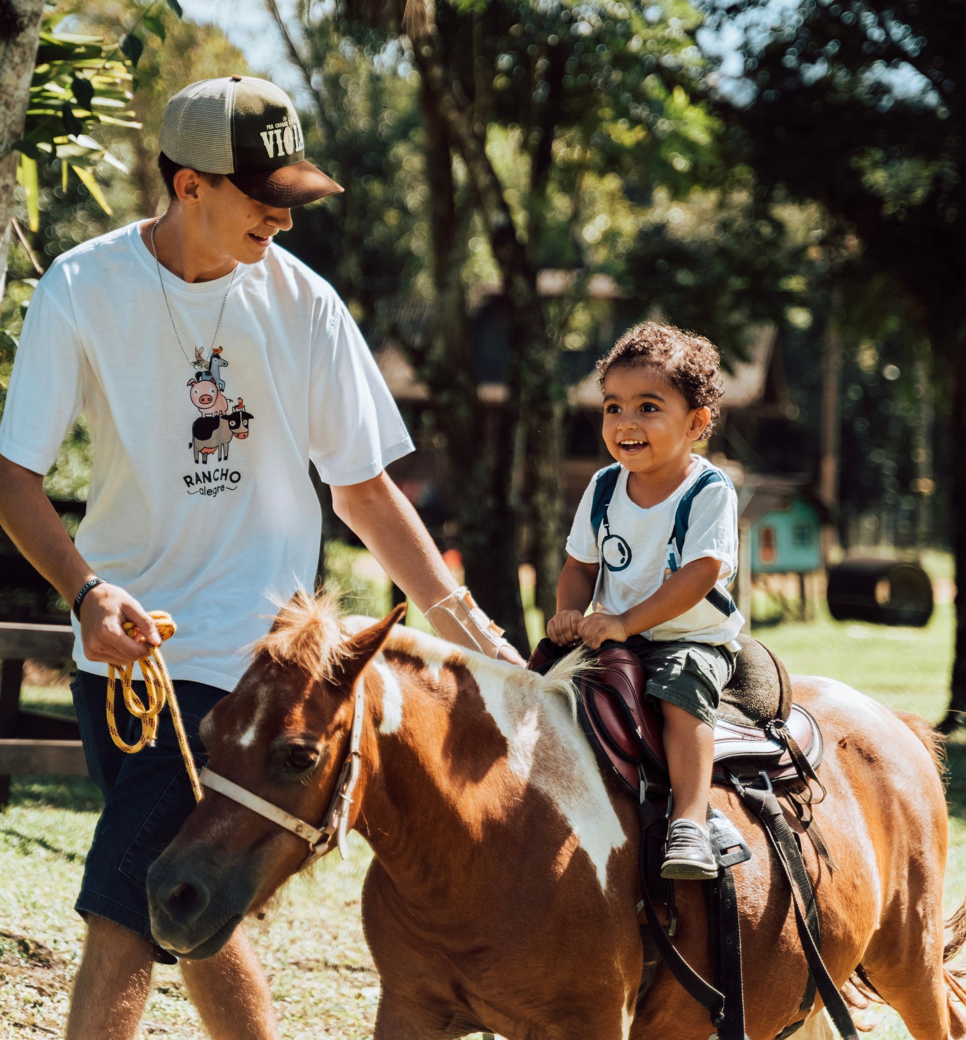 A proposta do Rancho é conectar as crianças com o mundo rural, onde elas podem passear à cavalo, alimentar e interagir com diversos animais da fazenda.